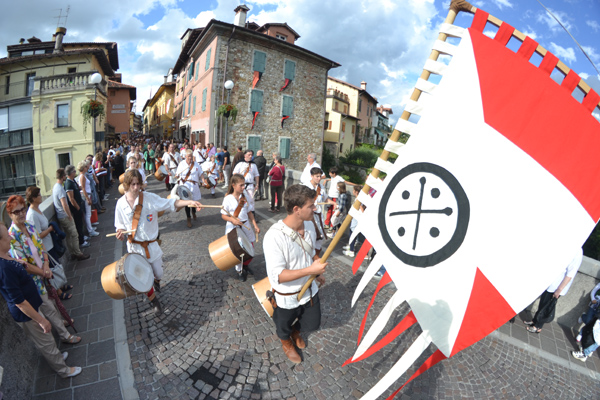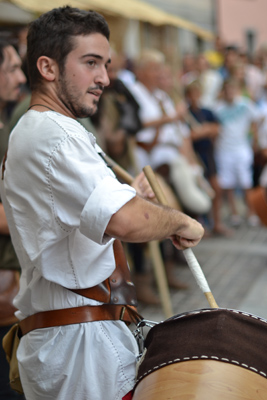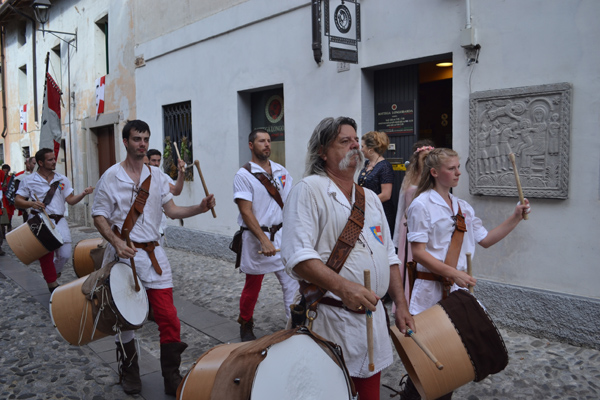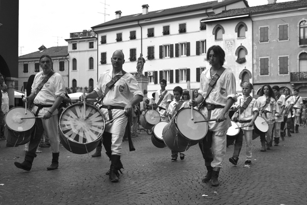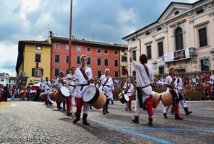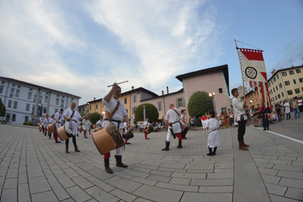 The ‘San Donato Cloth’ consisted in a confrontation between archers, crossbowmen, and successively sharpshooter representing the city boroughs and other towns or castles. To theses trials were added foot and horse races, in a frame of ostentatious entertainment, with a great affluence of nobles and commoners. The competition saw contenders from various origins, apart from a massive presence of people from Udine, there also arrived representatives from Treviso, Venice and Muggia. At the contest in 1548, 79 participants enrolled. The horse races took place on a course that by preference wound from the bell tower of the Cathedral to the Stone, called the Race Stone (still existing today) beyond the houses of Gagliano. The prizes for the winners were precious fabrics and because of the value of these, the ‘Cloth’ was a coveted trophy. In order that these were suitable to the importance and prestige of the town, there was no regard to expense: If necessary the fabrics were bought in Venice. In 1484, the Municipal Cloth, displayed to be shot at with crossbows, was of woven cloth; it could have been crimson damask, yellow damask or similar, always however of best quality. The lowest classified contestant received the proverbial sucking pig, or a hawk or a rooster. Since the year 2000 this centuries old tradition of the Cloth has been revived in all its splendour with great success.